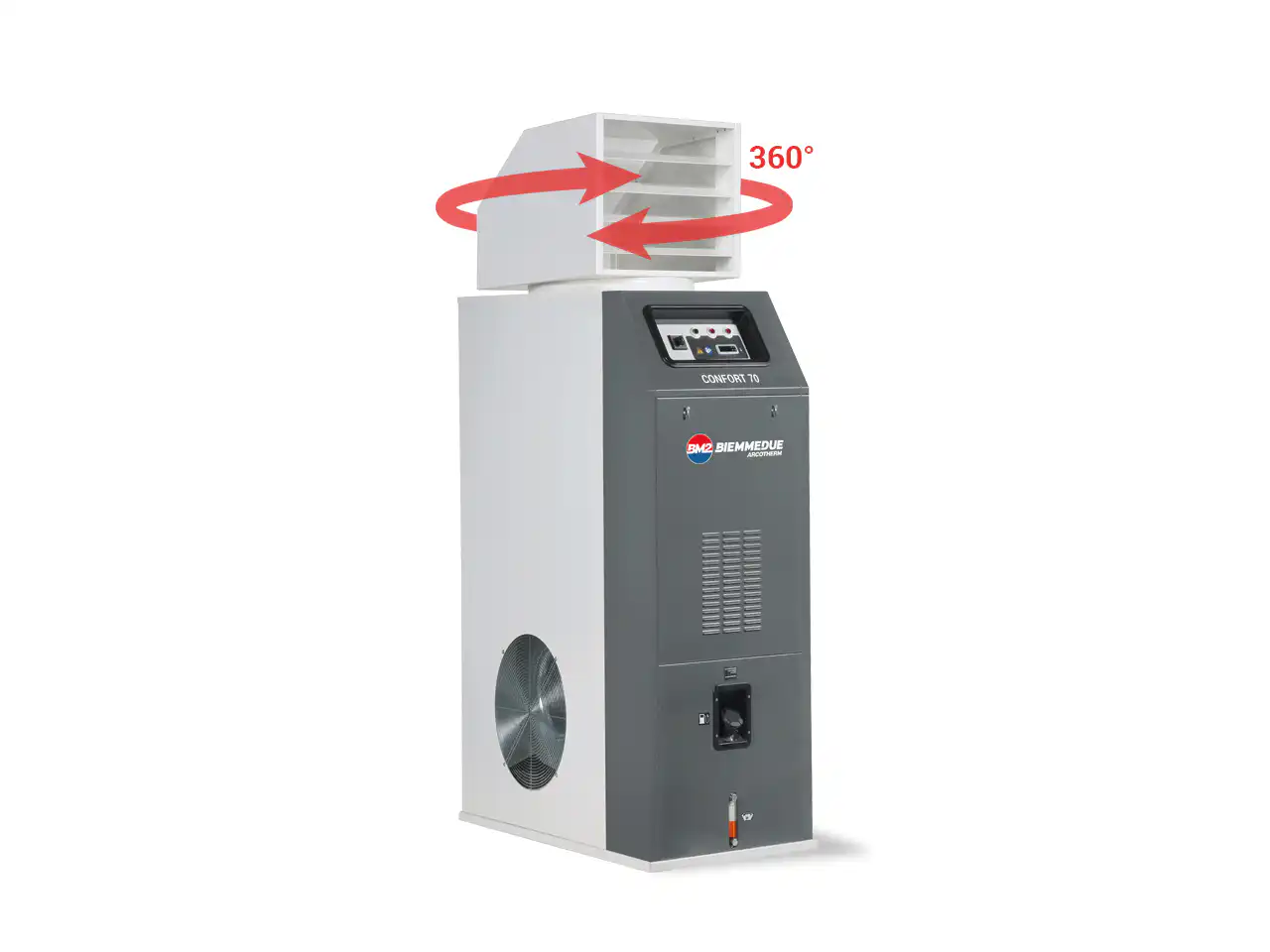 Dizel grejač BIEMMEDUE CONFORT 70 sa indirektnim sagorevanjem, snage 59,53 kW. Sa centrifugalnim ventilatorom i protokom vazduha od 6.000 m³/h, ovaj sistem pruža efikasnost od 93,58% i mogućnost povezivanja sa kanalima za distribuciju toplog vazduha.