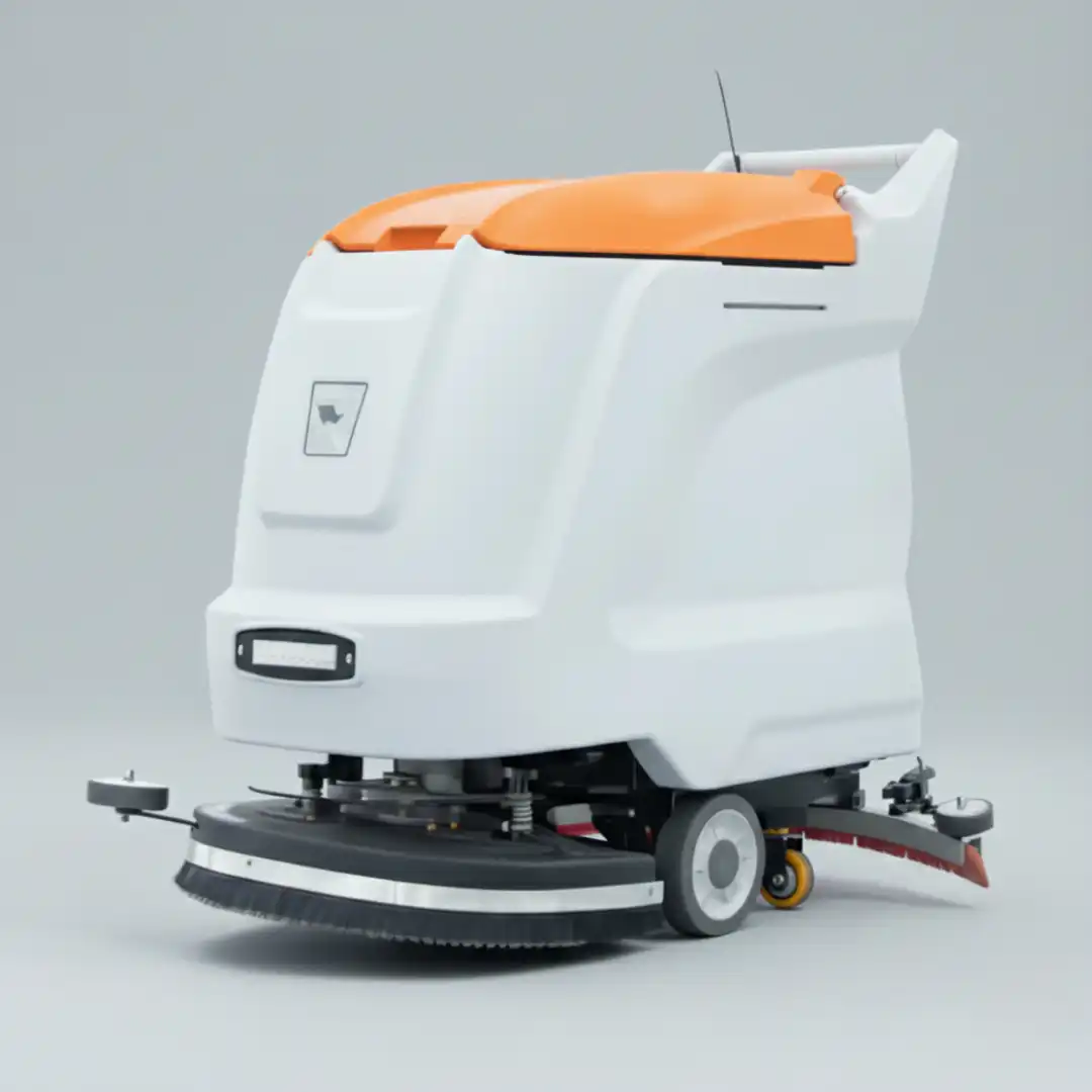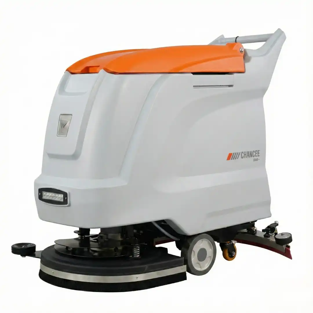 Samohodna CHANCEE XMD50 mašina za pranje podova sa narandžasto-belim telom, četkom i baterijom stoji u zatvorenom prostoru.