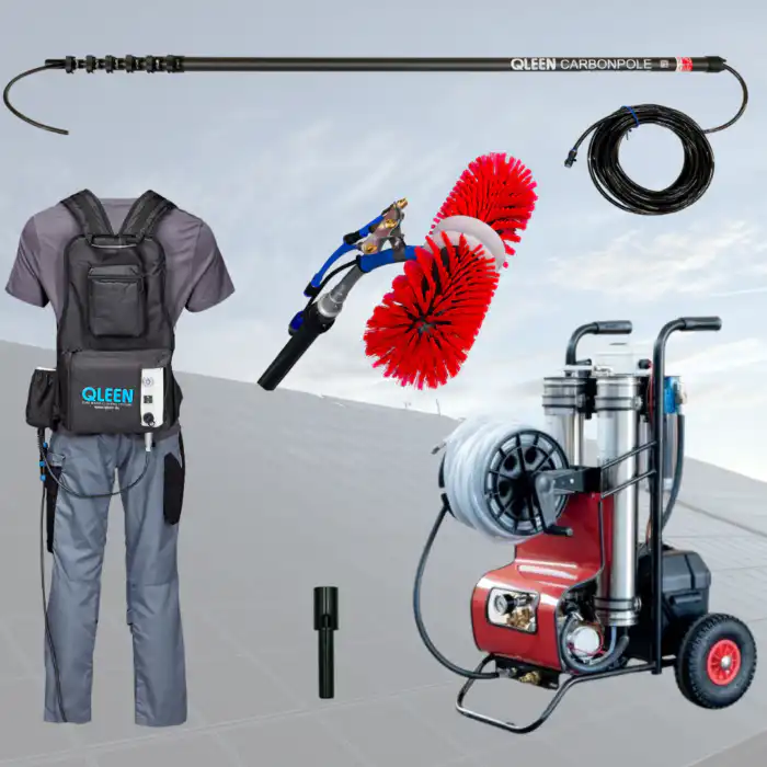 Mobilni Profi Set za pranje solarnih panela 12.6m nudi vrhunsku opremu za detaljno i efikasno čišćenje solarnih panela, prozora i fasada na visokim i teško dostupnim površinama. U kompletu su uključeni QLEEN CARBONPOLE teleskop dužine 12.6m, Idromatic Mobile RO DI 12V sistem za obradu vode i električna rotaciona četka ROTAQLEEN Classic.