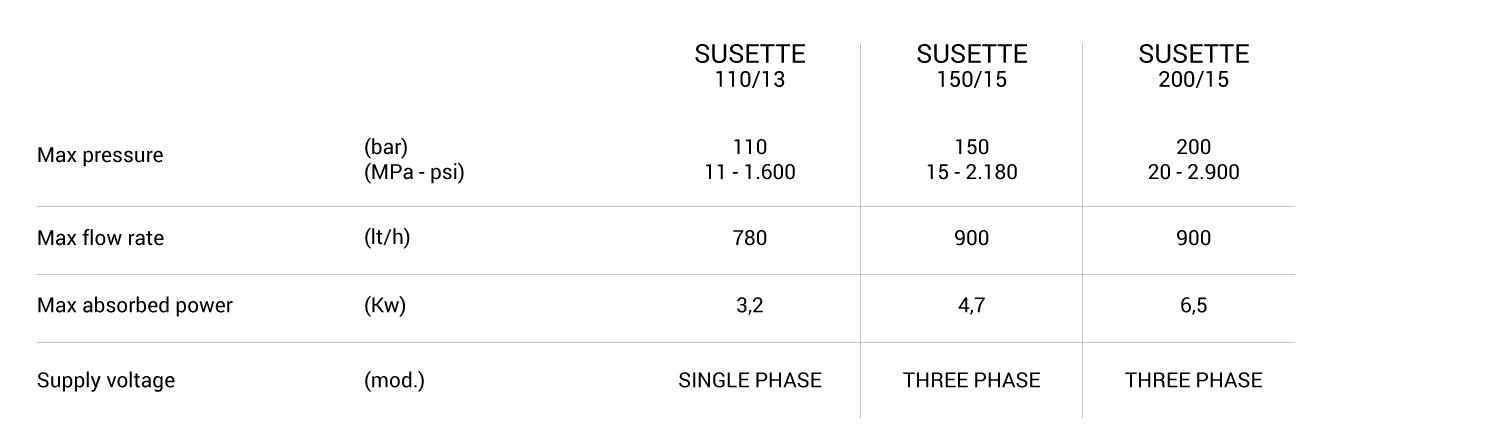 BIEMMEDUE Susette 200-15 je sposoban za proizvodnju tople vode do 140°C, idealno za odstranjivanje tvrdokornih naslaga, sa visokoefikasnim bojlerom (efikasnost preko 89%) i sistemom pre-ventilacije. Za pogon koristi dizel, podržan velikim rezervoarom od 35 litara i dodatnim rezervoarom za hemikalije od 3 litara.