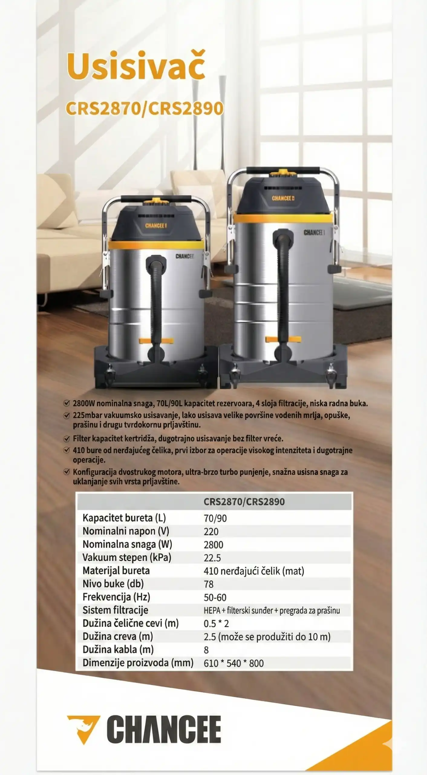 U svetu profesionalnog čišćenja, postoje poslovi koji “jedu” male usisivače. Građevinski šut, metalni opiljci, velike količine tečnosti ili fina industrijska prašina zahtevaju nešto više. Chancee CRS2870 je odgovor na te izazove.