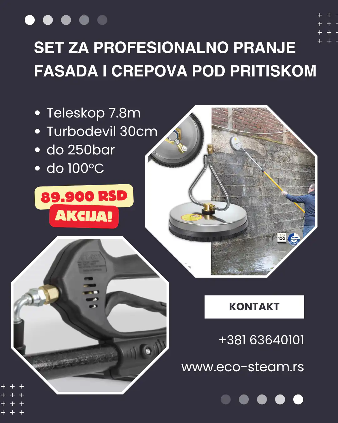 - Visok pritisak: Radi pod pritiskom do 250 bar za uklanjanje tvrdokornih naslaga.
